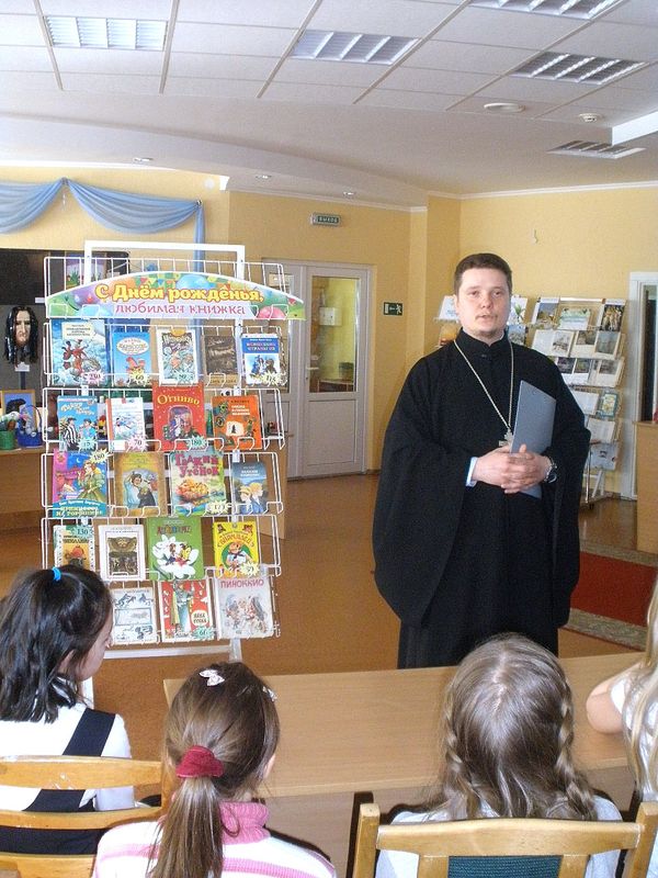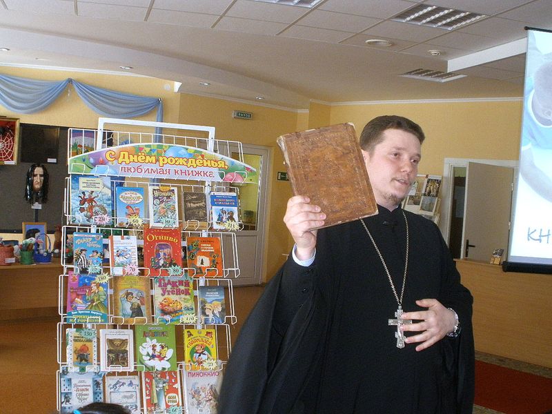 16 ìàðòà 2015 ãîäà â Öåíòðàëüíîé ãîðîäñêîé äåòñêîé áèáëèîòåêå èì. À.Ñ. Ïóøêèíà ñîñòîÿëîñü òîðæåñòâåííîå îòêðûòèå Íåäåëè äåòñêîé êíèãè.  ìåðîïðèÿòèè ïðèíÿë ó÷àñòèå êëèðèê íàøåãî õðàìà èåðåé Àëåêñèé Òèòîâ. Ñâÿùåííèê ðàññêàçàë äåòÿì î òîì, ÷òî êðîìå «Äíÿ äåòñêîé êíèãè» åñòü åù¸ îäèí ïðàçäíèê, êîòîðûé îòìå÷àåòñÿ 14 ìàðòà, è íàçûâàåòñÿ «Äåíü ïðàâîñëàâíîé êíèãè». Ðåáÿòà óçíàëè î òîì, êàê ïîÿâèëèñü ïåðâûå êíèãè, êàê èõ âíà÷àëå ïåðåïèñûâàëè îò ðóêè.