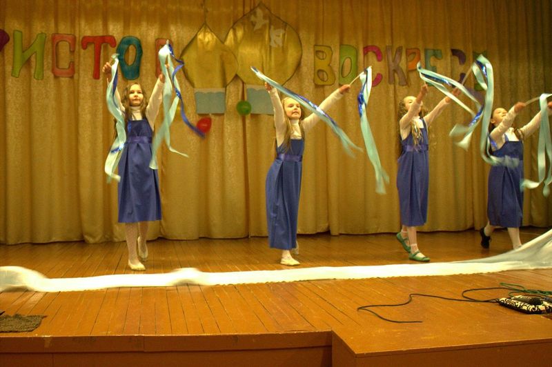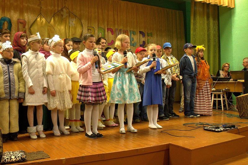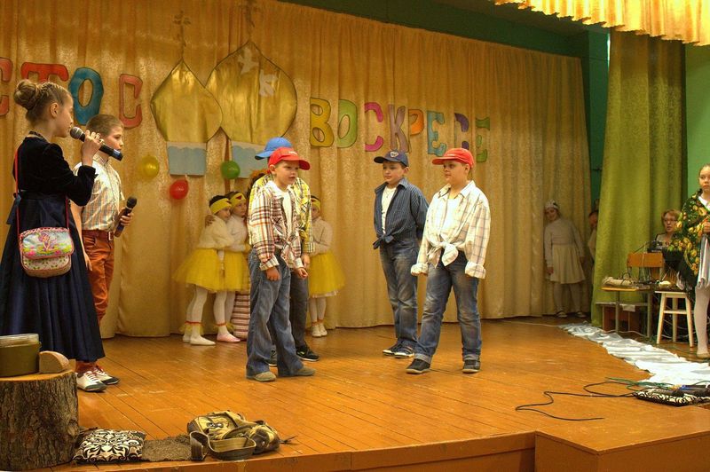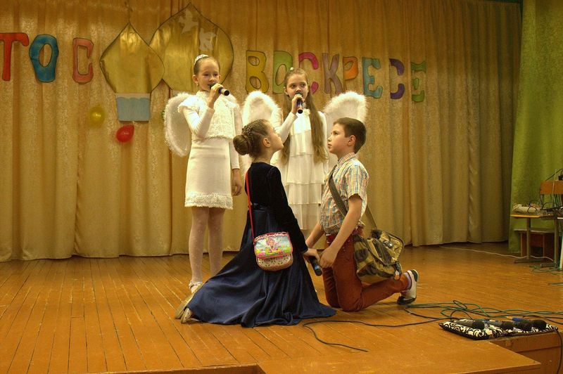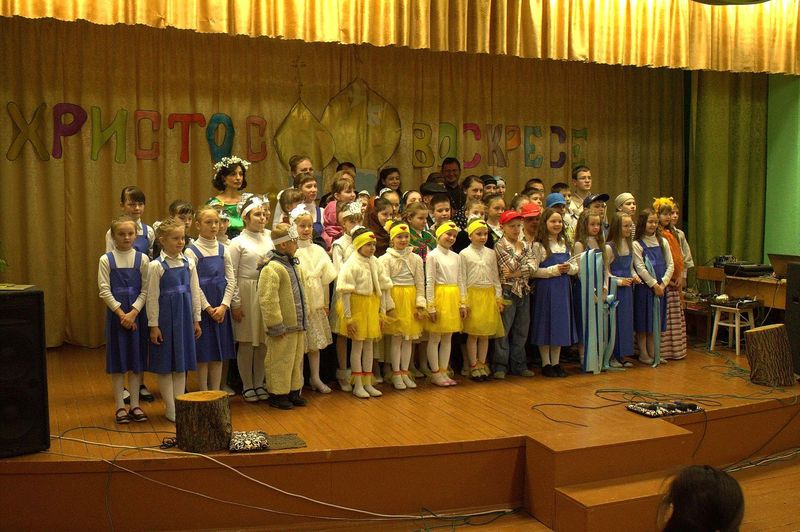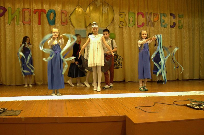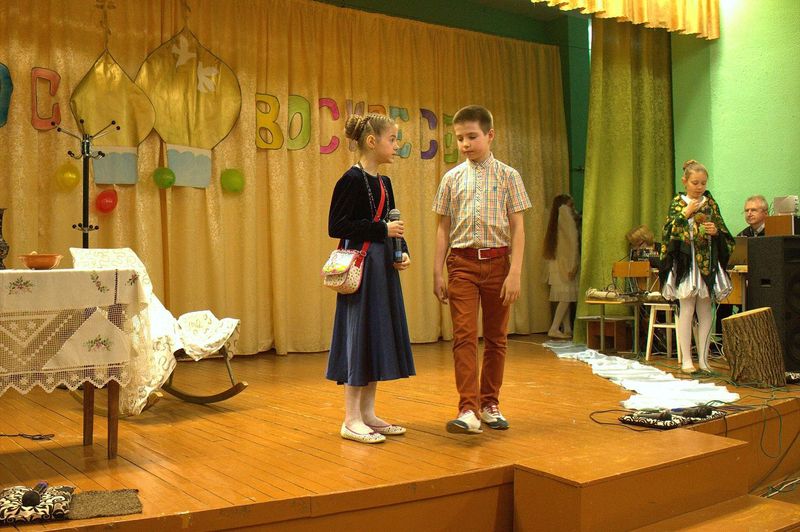 íà÷àëå çðèòåëåé ïîðàäîâàë äåòñêèé öåðêîâíûé õîð ïîä ðóêîâîäñòâîì Íàòàëüè Îëåñèê è Äàðüè Êóëèê. Îñîáåííî çàïîìíèëàñü ïàñõàëüíàÿ ïåñíÿ «Ëàñòî÷êè» è òðîïàðü Ïàñõè íà ðóññêîì è ãðå÷åñêîì ÿçûêàõ. Çàòåì âñå îòïðàâèëèñü â Èåðóñàëèì âðåì¸í Èèñóñà Õðèñòà. Ó÷åíèêè 4 êëàññà ïîêàçàëè íàïîëíåííûé ãëóáîêèì ñìûñëîì ñïåêòàêëü «Ñëåïàÿ ïðèíöåññà Ôàâñòà è Èèñóñ Õðèñòîñ», ïî ñþæåòó èåðîìîíàõà Çèíîíà. Äàëåå íà÷àëàñü ìóçûêàëüíàÿ ñêàçêà «Ìàìà è Ïå÷àëü-Òîñêà». Ïåðñîíàæè ñìåíÿëè äðóã äðóãà, òàíöû ÷åðåäîâàëèñü ñ ðàçíîîáðàçíûìè ïåñíÿìè. Ãëàâíûå ãåðîè, áðàò è ñåñòðà, êîòîðûõ èãðàëè Ãëåá Öâåòêîâ è Ïîëèíà Äàöêåâè÷, â ïóòè ïîçíàëè èñòèíó – Ãîñïîäü âñåãäà ñ íàìè è âñåãäà ãîòîâ îòêëèêíóòüñÿ íà íàøè èñêðåííèå ìîëèòâû. Òîðæåñòâåííûìè âîçãëàñàìè «Õðèñòîñ Âîñêðåñå» - «Âîèñòèíó Âîñêðåñå», íàïîëíèëñÿ çàë â êîíöå ïðåäñòàâëåíèÿ. Âñå àðòèñòû âûøëè íà ñöåíó è èñïîëíèëè ôèíàëüíóþ ïåñíþ.