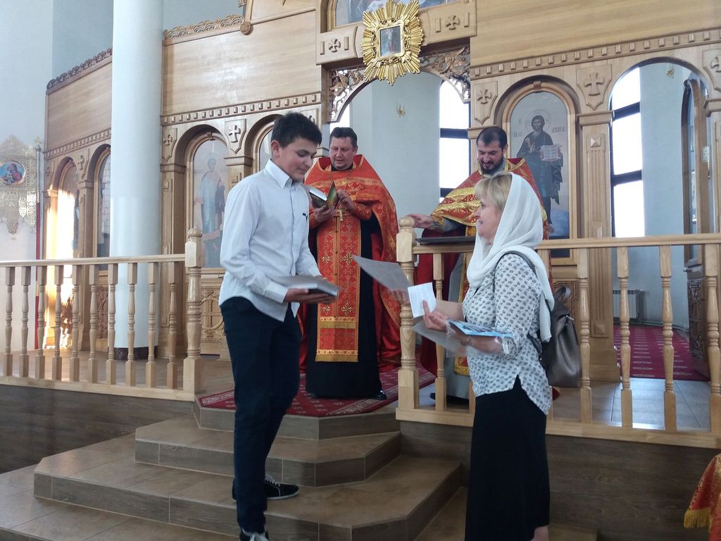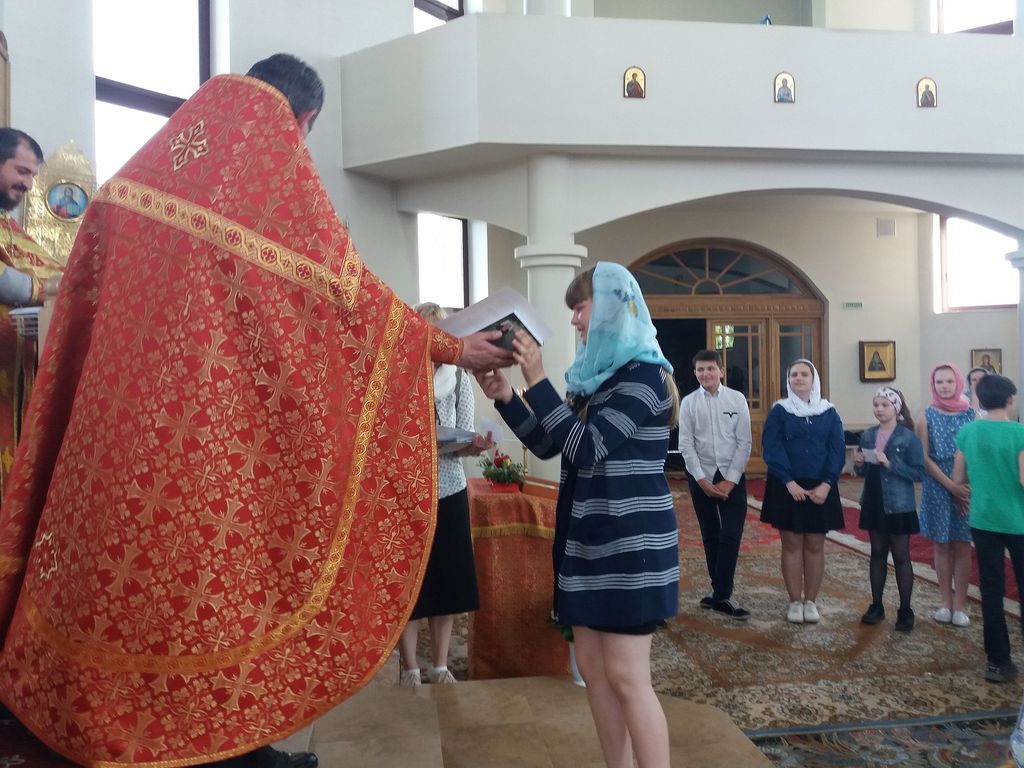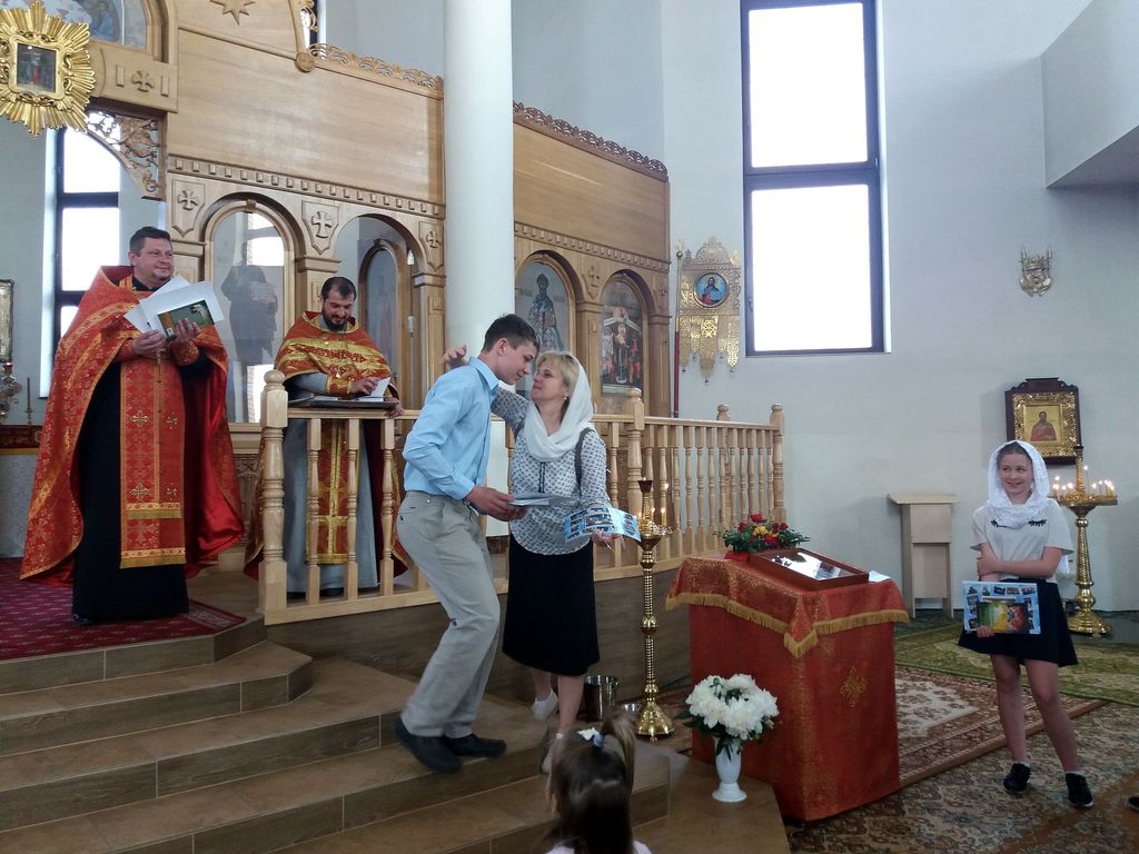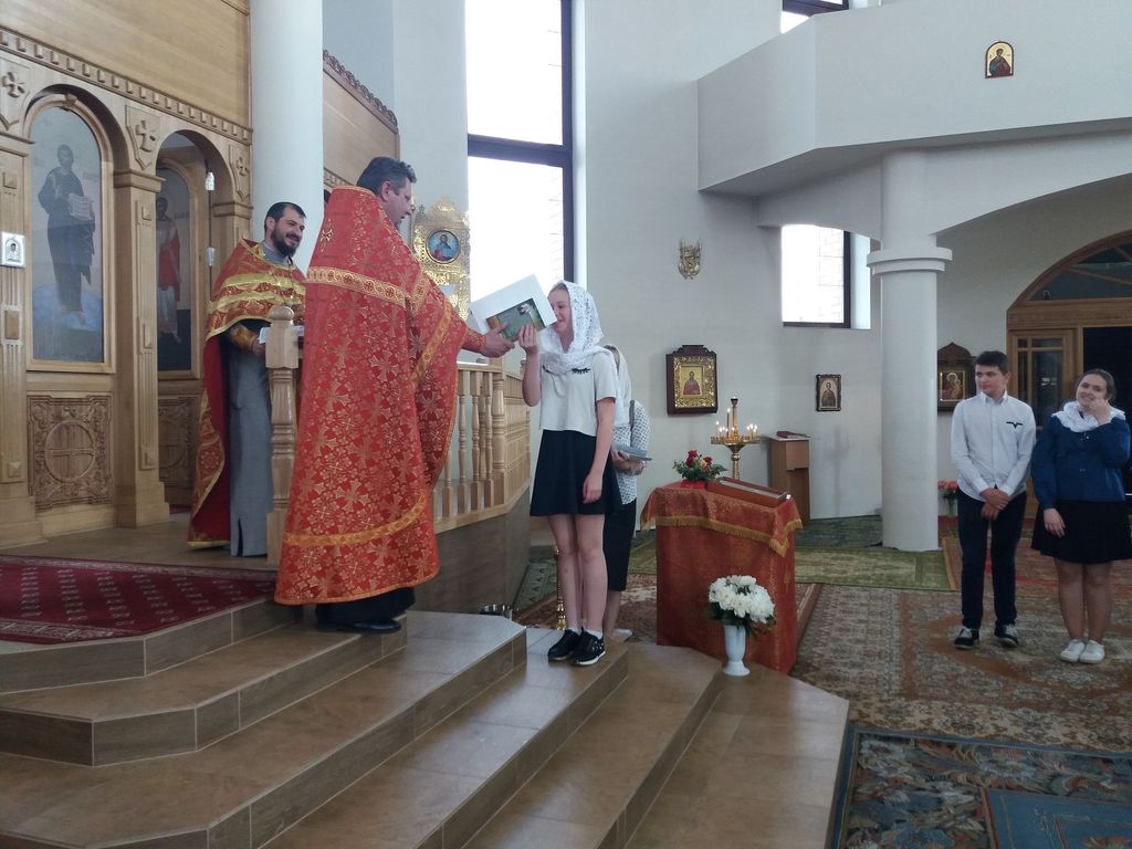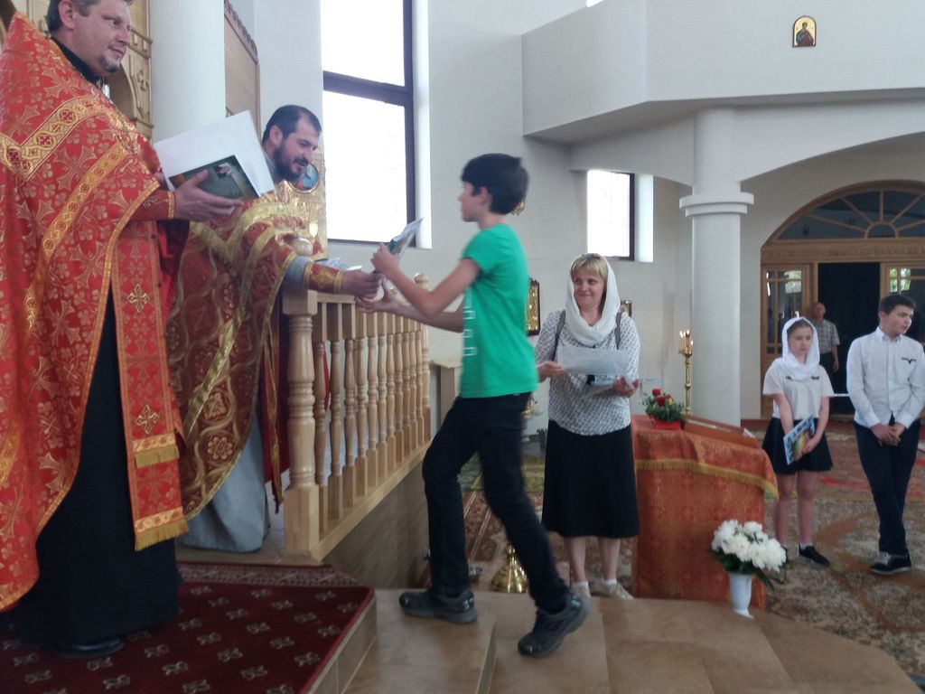 êîíöå, ïî òðàäèöèè, âñå, êòî ïðèñóòñòâîâàë â õðàìå, äðóæíî èñïîëíèëè ãèìí íàøåé Âîñêðåñíîé øêîëû. Ïîñëå òîðæåñòâåííîé ÷àñòè ðîäèòåëè âûïóñêíèêîâ ïîäàðèëè íàñòîÿòåëþ õðàìà áîëüøîé ôîòîàëüáîì è ïàìÿòíûé êîëëàæ, à çàòåì äåòè îòïðàâèëèñü íà ñëàäêèé ñòîë.