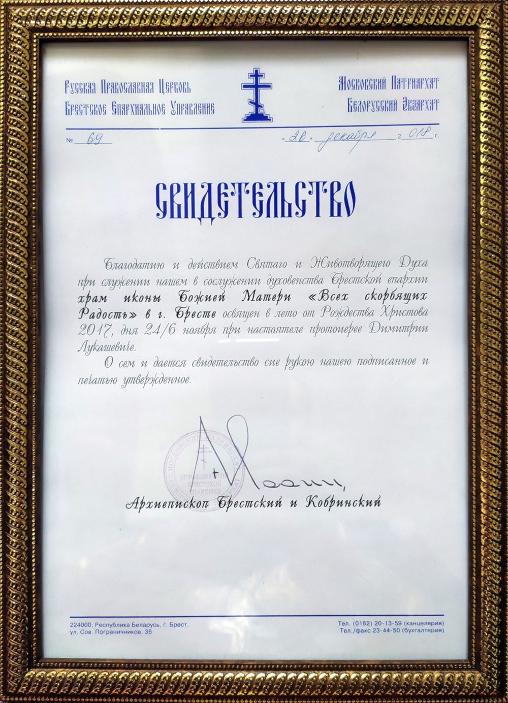 6 ноября 2017 года, в день празднования в честь иконы Божией Матери «Всех Скорбящих Радость», был освящён главный верхний одноимённый храм. Чин освящения совершил Высокопреосвященнейший Иоанн, Архиепископ Брестский и Кобринский.