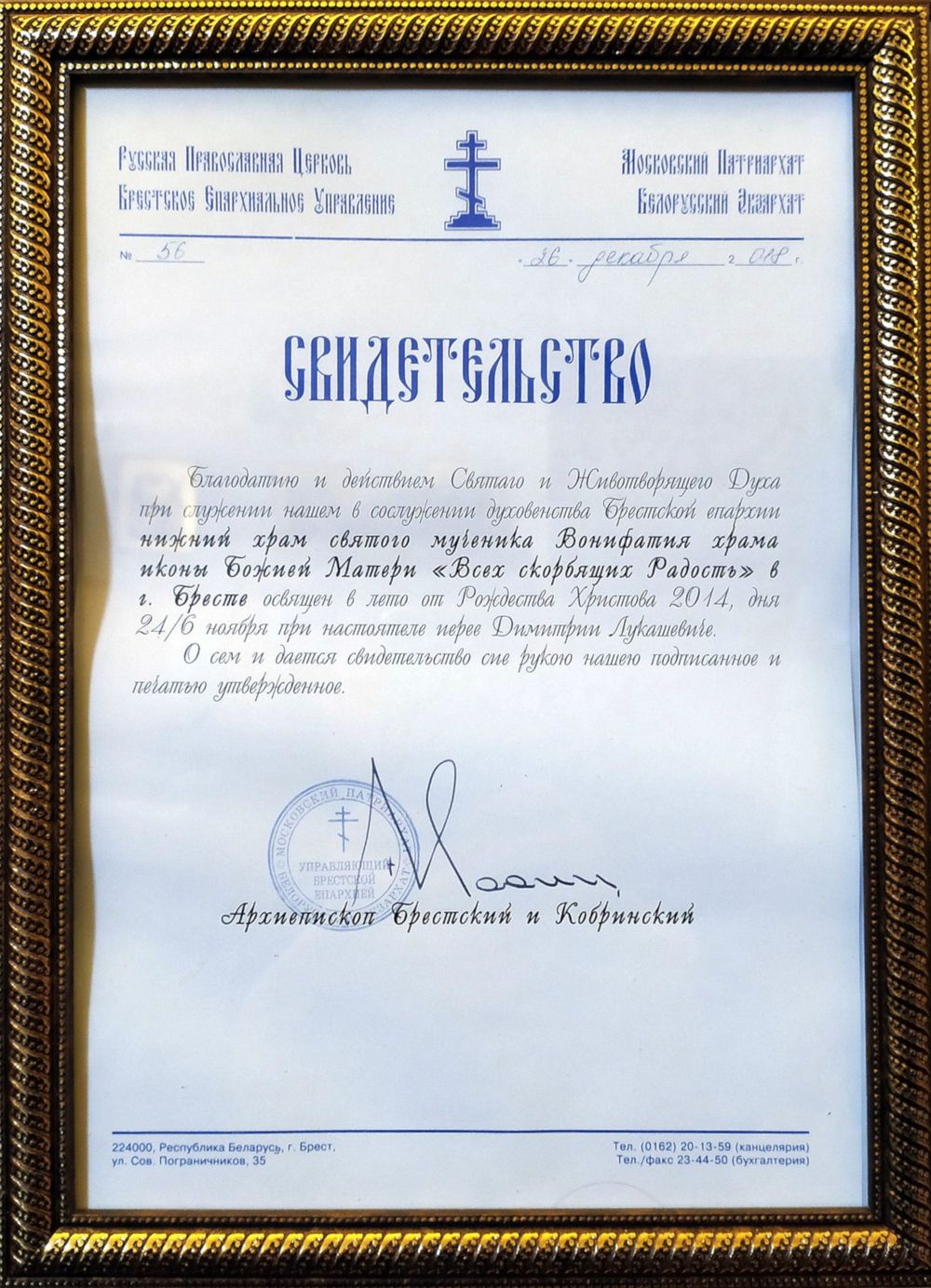 6 ноября 2014 года, в день празднования в честь иконы Божией Матери «Всех Скорбящих Радость», был освящён в честь святого мученика Вонифатия нижний придел строящегося храма. Чин освящения и первую Божественную литургию совершил Преосвященнейший Иоанн, Епископ Брестский и Кобринский, в сослужении множества священнослужителей и духовенства прихода.