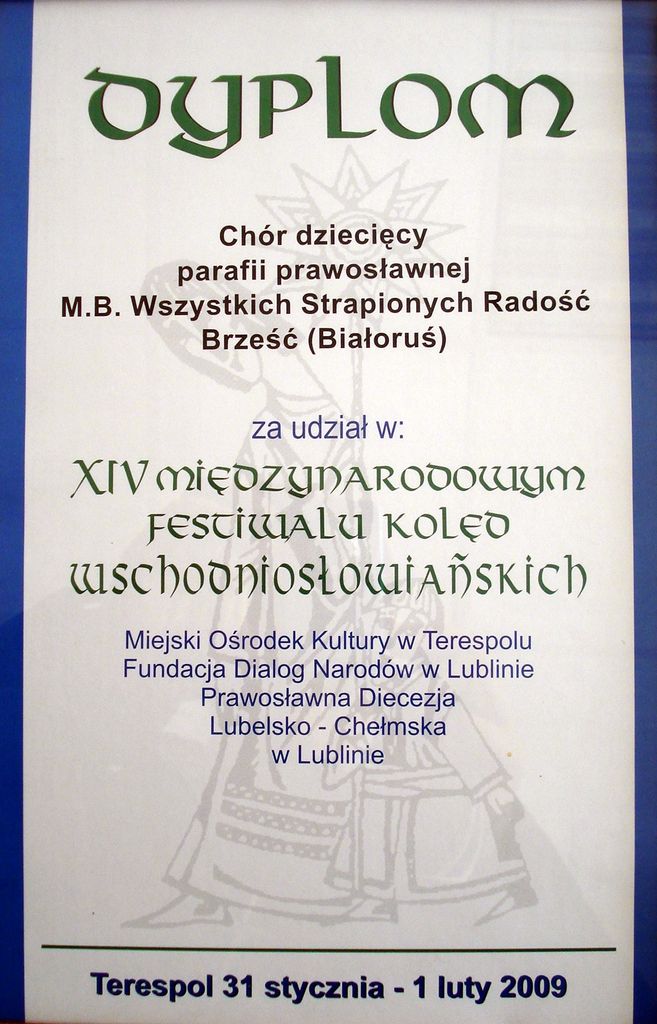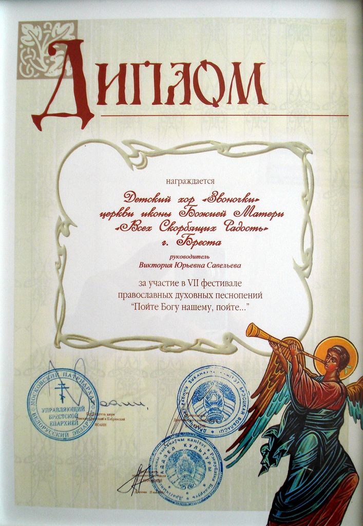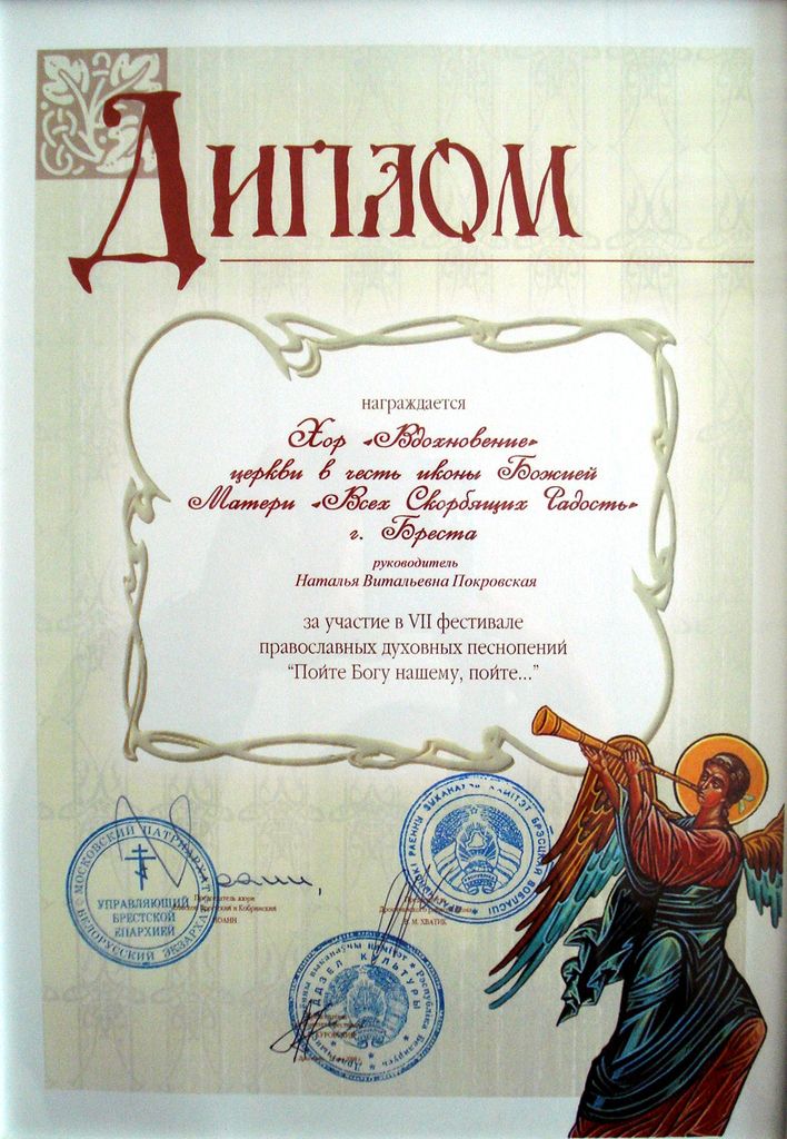 Дипломы VII фестиваля православных духовных песнопений в Дрогичине